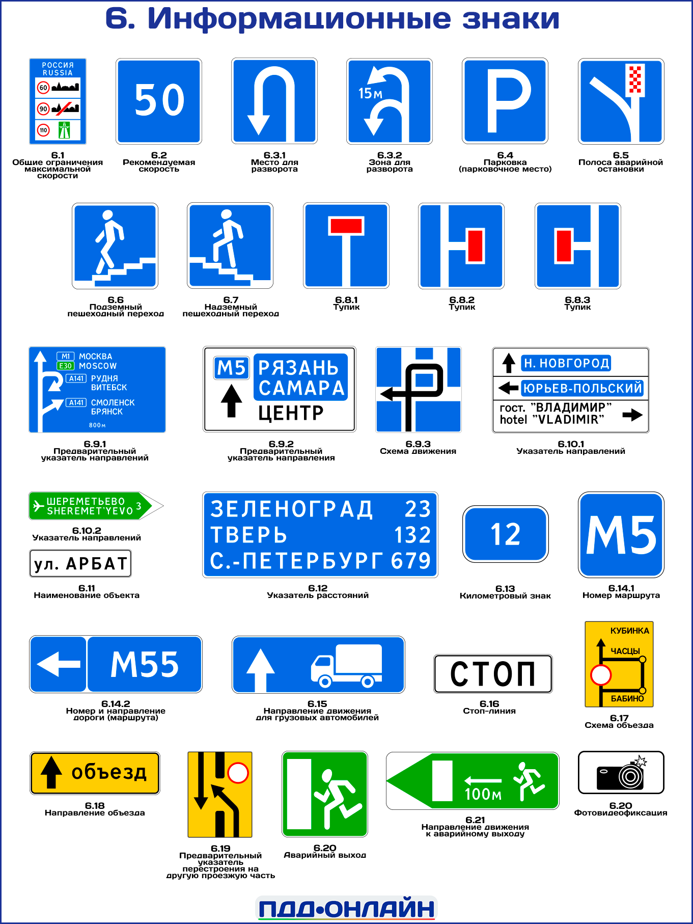 Согласно разделу 5 Приложения № 1 к ПДД РФ, информационные знаки входят в шестую группу дорожных знаков и обозначаются номерами от 6.1 до 6.22. Всего в этой группе — 29 знаков.
