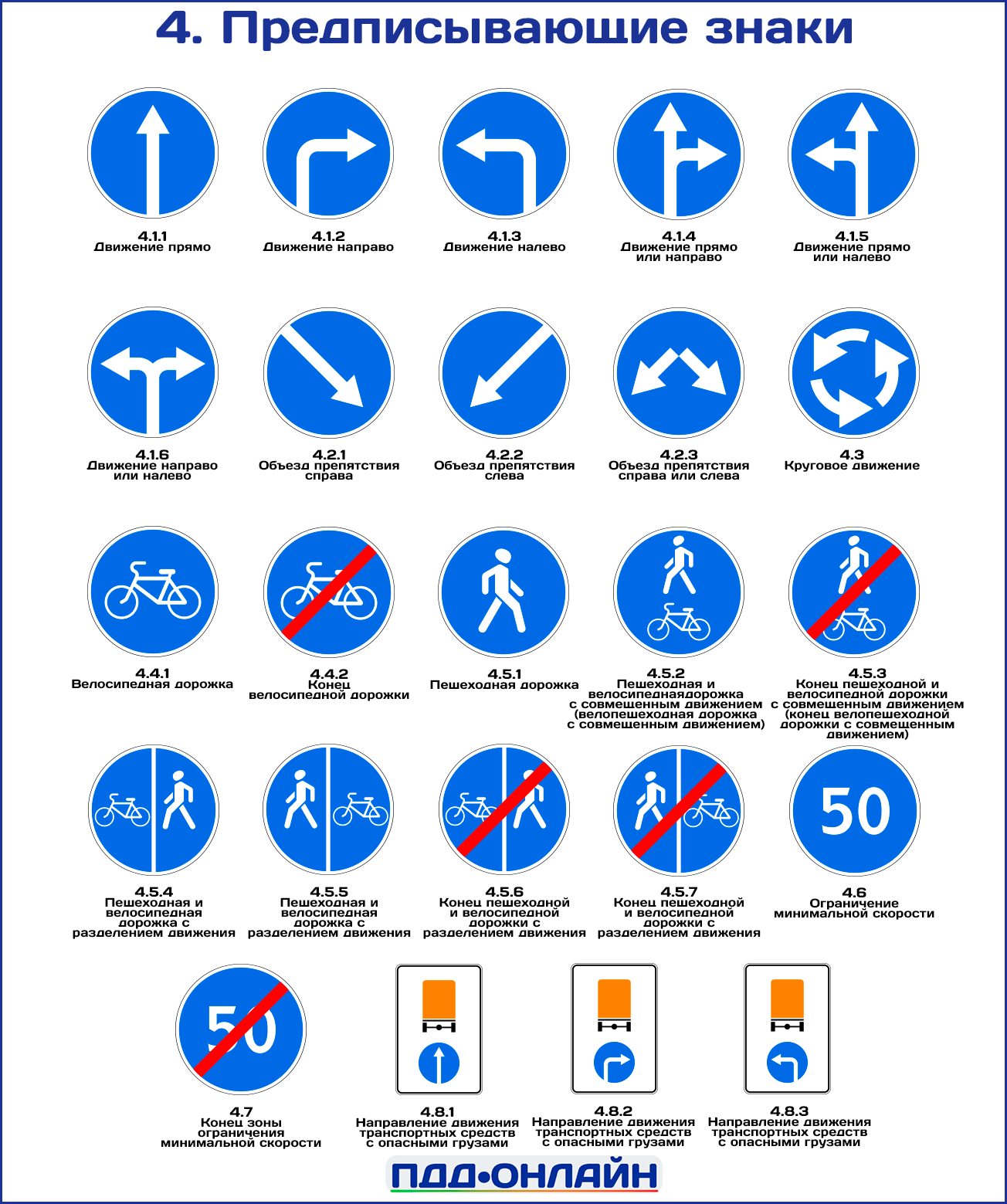 В ПДД РФ предписывающие знаки объединены в раздел 4 Приложения 1 и насчитывают 24 позиции, разделенные по функционалу. Основная классификация: